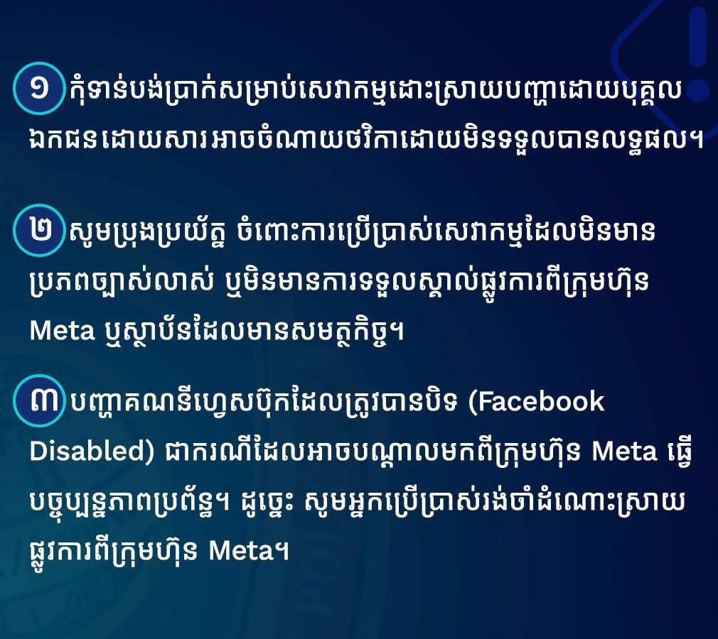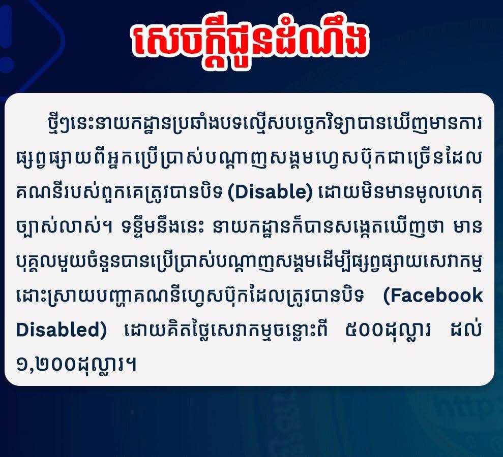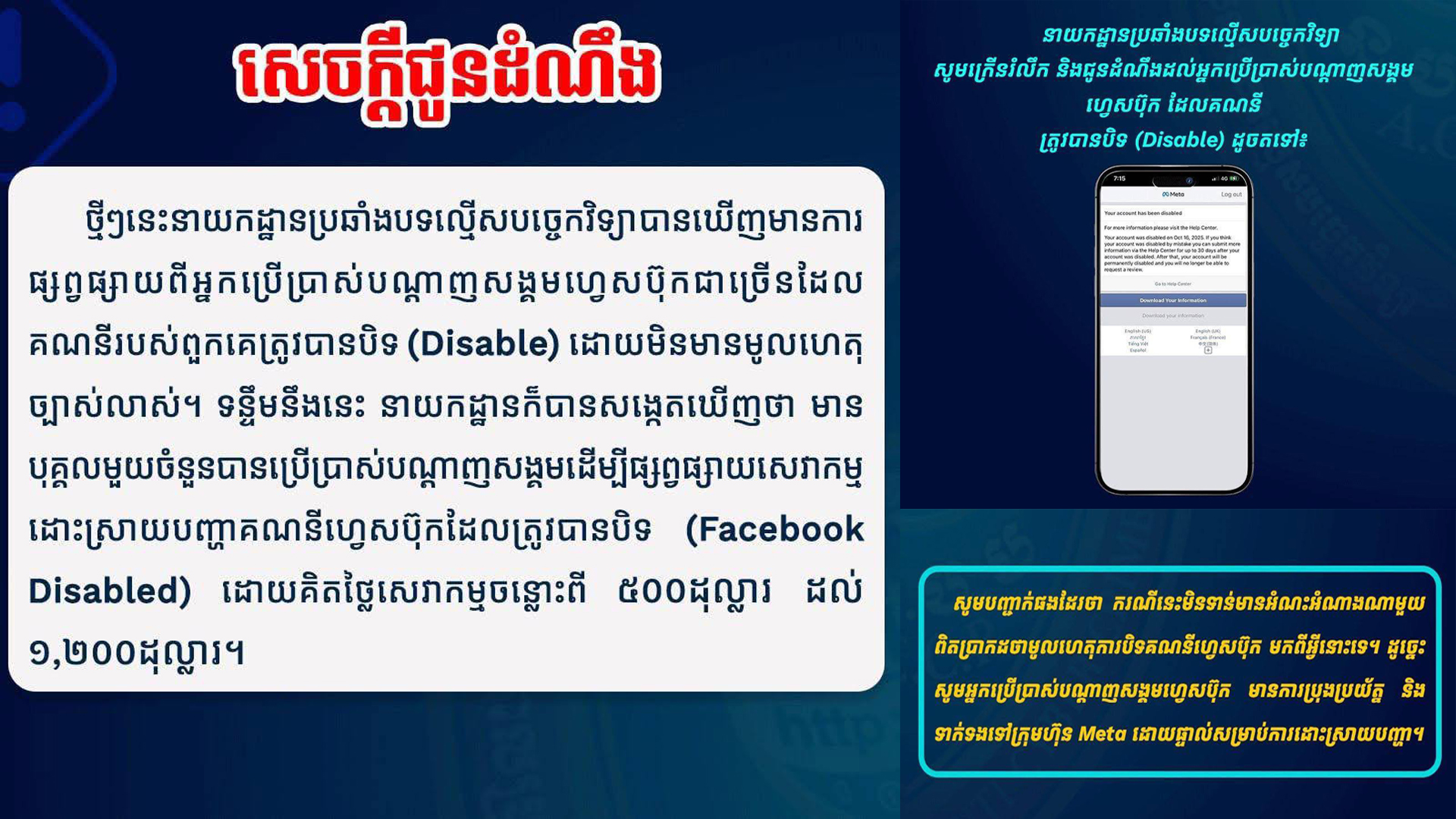 នាយកដ្ឋានប្រឆាំងបទល្មើសបច្ចេកវិទ្យា សូមក្រើនរំលឹក និងជូនដំណឹងដល់អ្នកប្រើប្រាស់បណ្ដាញសង្គមហ្វេសប៊ុក ដែលគណនីត្រូវបានបិទ (Disable) ដូចតទៅ៖