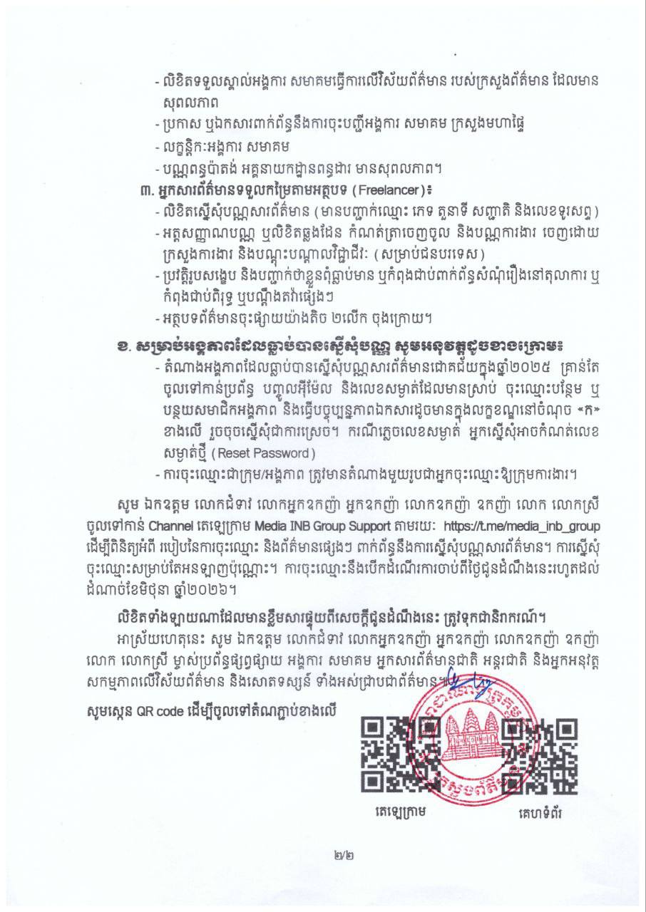 សេចក្តីជូន​ដំណឹង​ស្តីពីការបើកទទួល​ចុះឈ្មោះស្នើសុំបណ្ណសារព័ត៌មាន​សម្រាប់​ឆ្នាំ២០២៦ និងបញ្ចប់​សុពលភាពបណ្ណសារព័ត៌មាន​ឆ្នាំ២០២៥