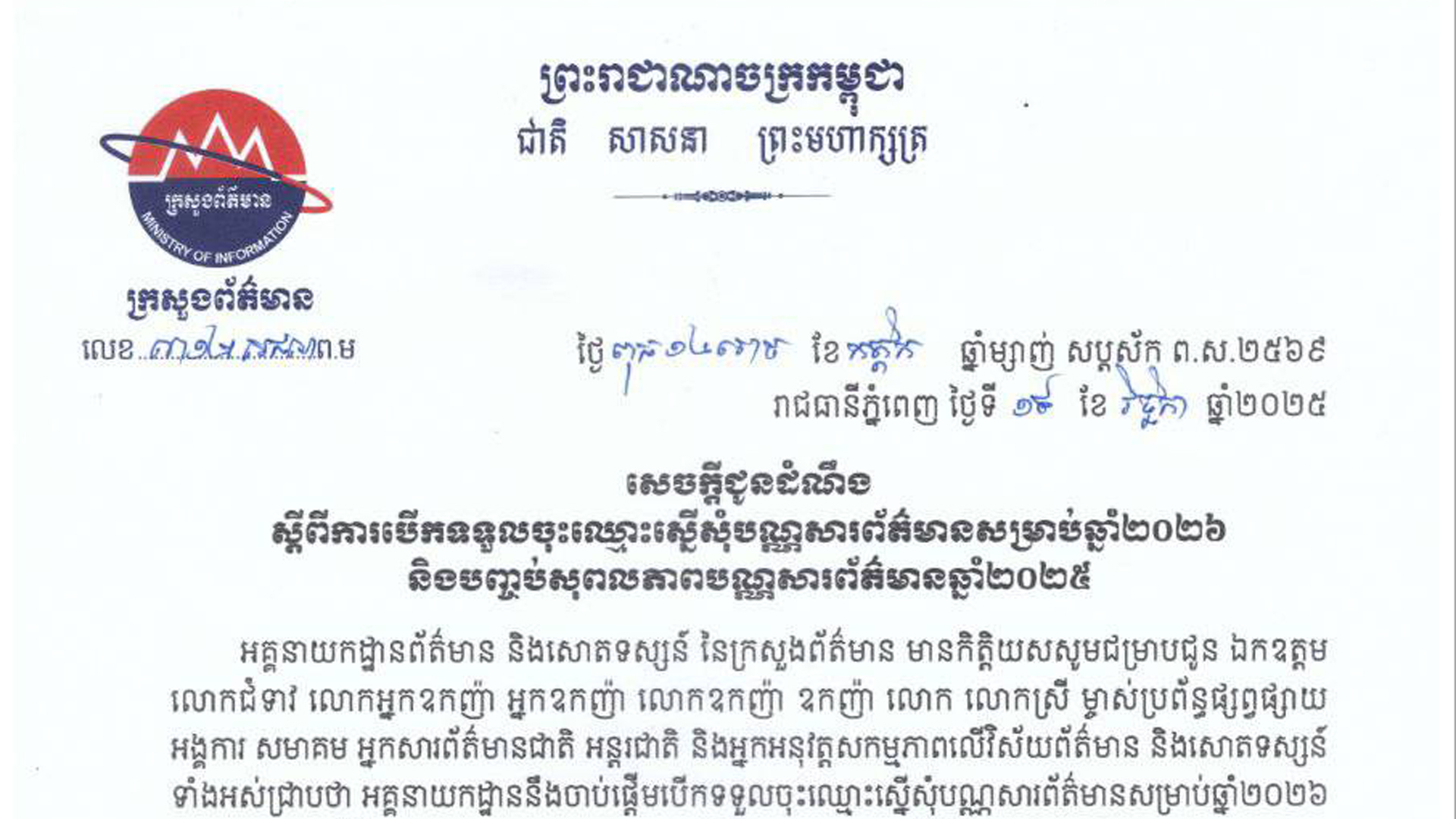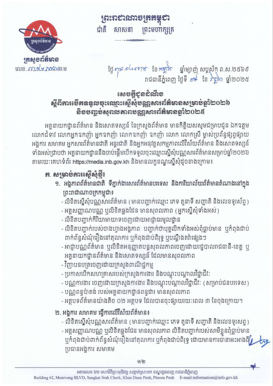 សេចក្តីជូន​ដំណឹង​ស្តីពីការបើកទទួល​ចុះឈ្មោះស្នើសុំបណ្ណសារព័ត៌មាន​សម្រាប់​ឆ្នាំ២០២៦ និងបញ្ចប់​សុពលភាពបណ្ណសារព័ត៌មាន​ឆ្នាំ២០២៥
