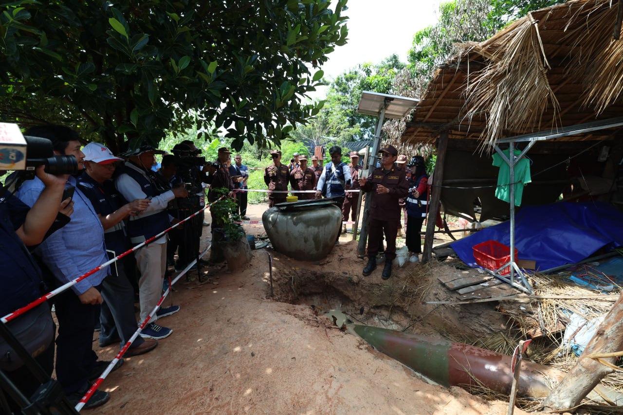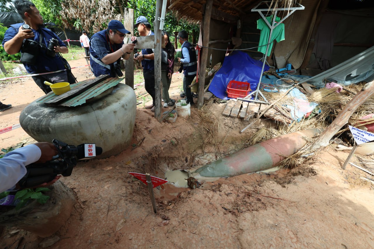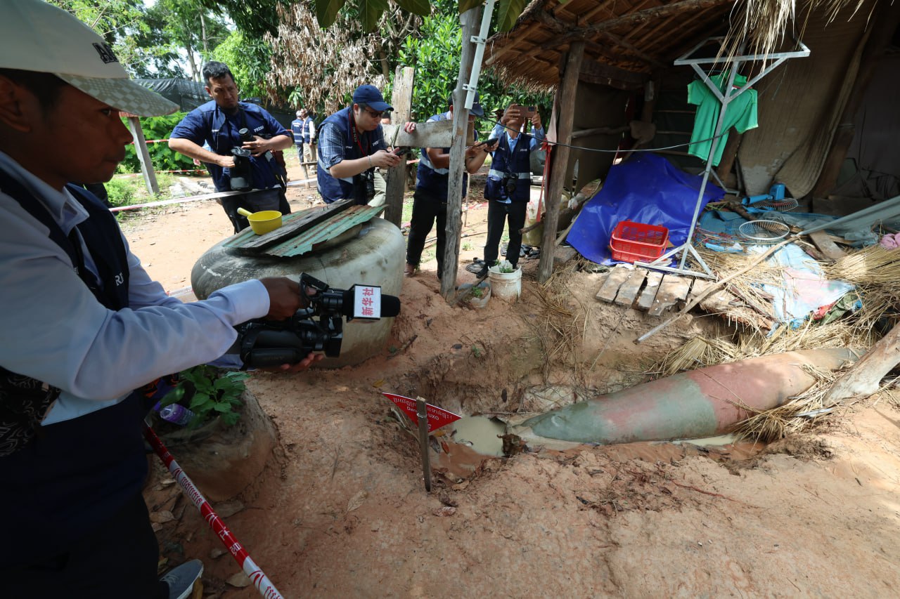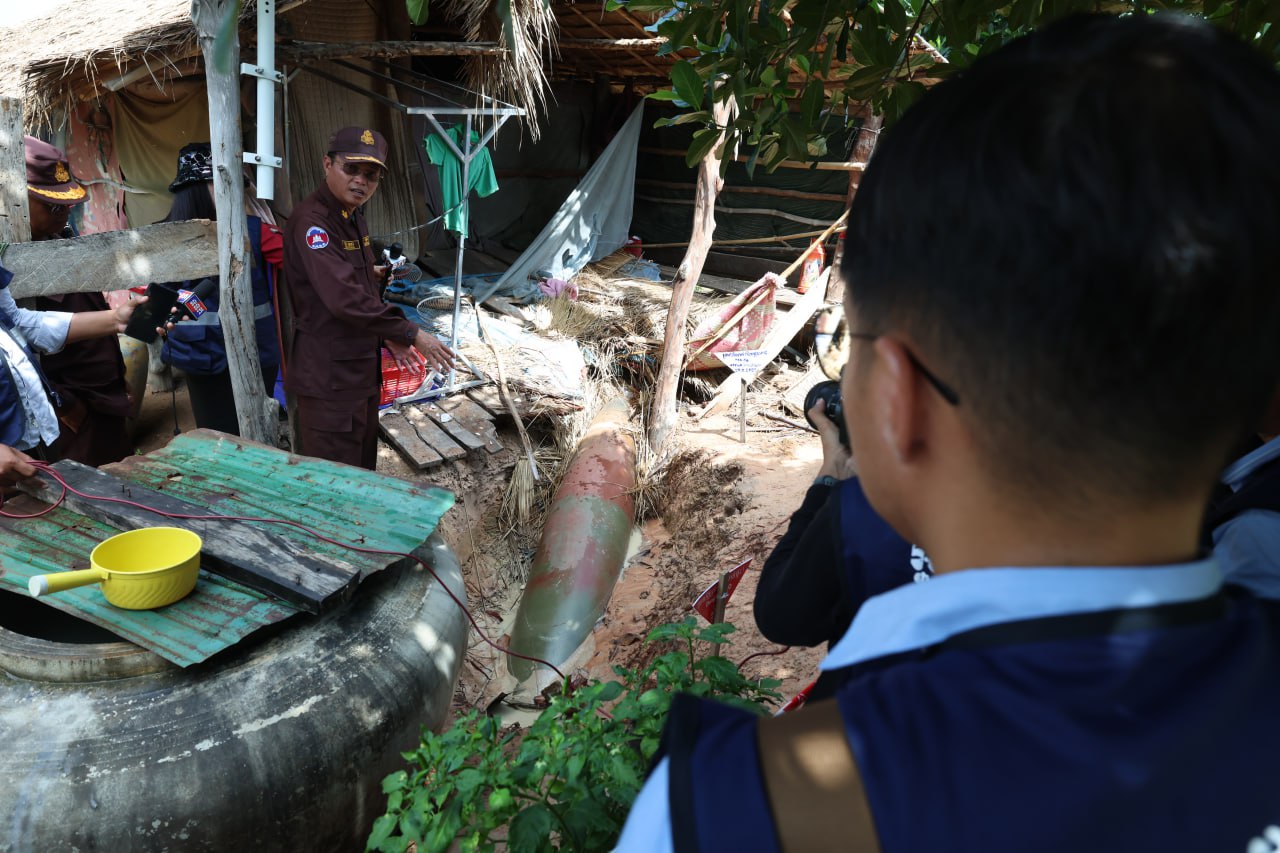 (ឧត្តរមានជ័យ)៖ លោក ហេង រតនា ប្រតិភូរាជរដ្ឋាភិបាល ទទួលបន្ទុកជាអគ្គនាយកមជ្ឈមណ្ឌលកម្ចាត់មីនកម្ពុជា (ស៊ីម៉ាក់) បានធ្វើបទបង្ហាញពីទីតាំងគ្រាប់បែក MK-84 ដែលកងទ័ពថៃទម្លាក់ពីលើយន្តហោះ F-16 នៅភូមិឋានពលរដ្ឋ នៅភូមិថ្មដូន ឃុំគោកមន ស្រុកបន្ទាយអំពិល ខេត្តឧត្តរមានជ័យ ដល់អ្នកសារព័ត៌មានតំបន់អាស៊ី។