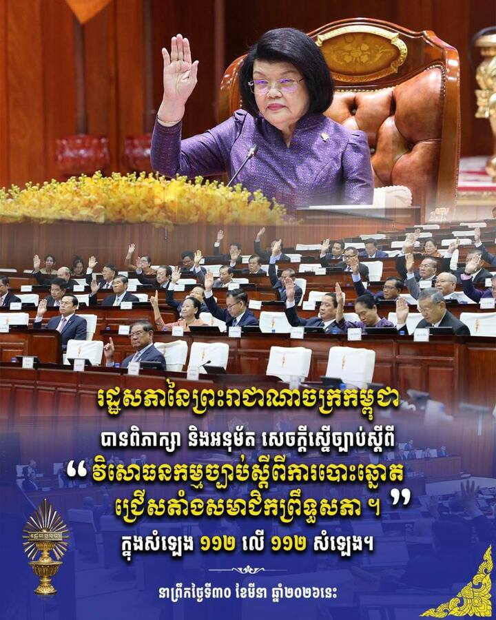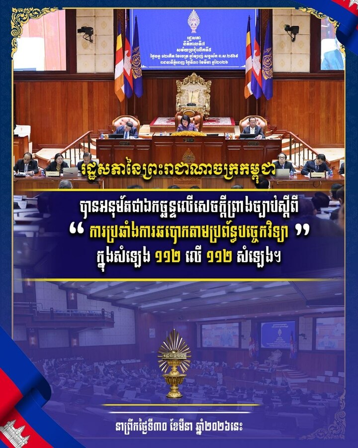 សម្តេចមហារដ្ឋសភាធិការធិបតី ឃួន សុដារី ប្រធានរដ្ឋសភា នៃព្រះរាជាណាចក្រកម្ពុជា អញ្ជើញជាអធិបតី បន្តសម័យប្រជុំរដ្ឋសភាលើកទី៥ នីតិកាលទី៧ ដើម្បី ១. ពិភាក្សា និងអនុម័តសេចក្តីព្រាងច្បាប់ស្តីពី ការប្រឆាំងការឆបោកតាមប្រព័ន្ធបច្ចេកវិទ្យា និង ២. ពិភាក្សា និងអនុម័តសេចក្តីស្នើច្បាប់ស្តីពី វិសោធនកម្មច្បាប់ស្តីពីការបោះឆ្នោតជ្រើសតាំងសមាជិកព្រឹទ្ធសភា ព្រមទាំងអនុម័តយល់ព្រមសេចក្តីព្រាងសេចក្តីសម្រេចស្តីពី តួនាទី និងភារកិច្ចរបស់គណ:កម្មការនានានៃរដ្ឋសភា នាព្រឹកថ្ងៃទី៣០ ខែមីនា ឆ្នាំ២០២៦ នៅវិមានរដ្ឋសភា រាជធានីភ្នំពេញ។