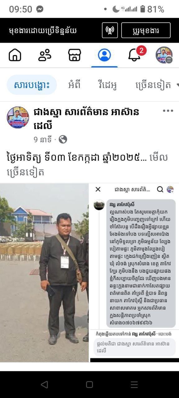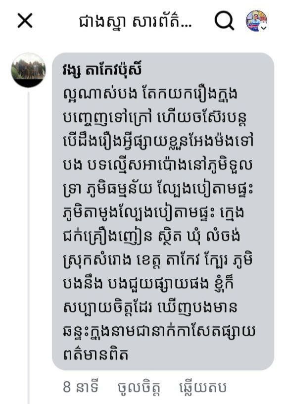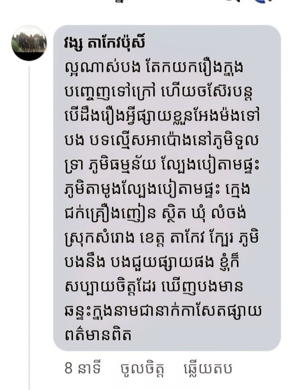 សូមមតិមហាជនជួយពិចារណាតាមការគួរ ផងចុះ បុគ្គលខាងលើមានចរិតមិនគម្បីដល់អ្នកសារព័ត៌មានយើងខ្ញឡើយខណះដែលពេលពួកគេមាបញ្ហាខ្វែងគំនិតគ្នាយើងខ្ញុំជាអ្នកសារព័ត៌មានដូចគ្នាខំចំណាយពេលទៅចូលរូមផ្ដល់យោបលនិងកម្លាំងចិត្តតែបែរជាចោទថាទៅកាងរឿងខ្លូនទៅវិញ សុំខ្លូាចហើយ ។