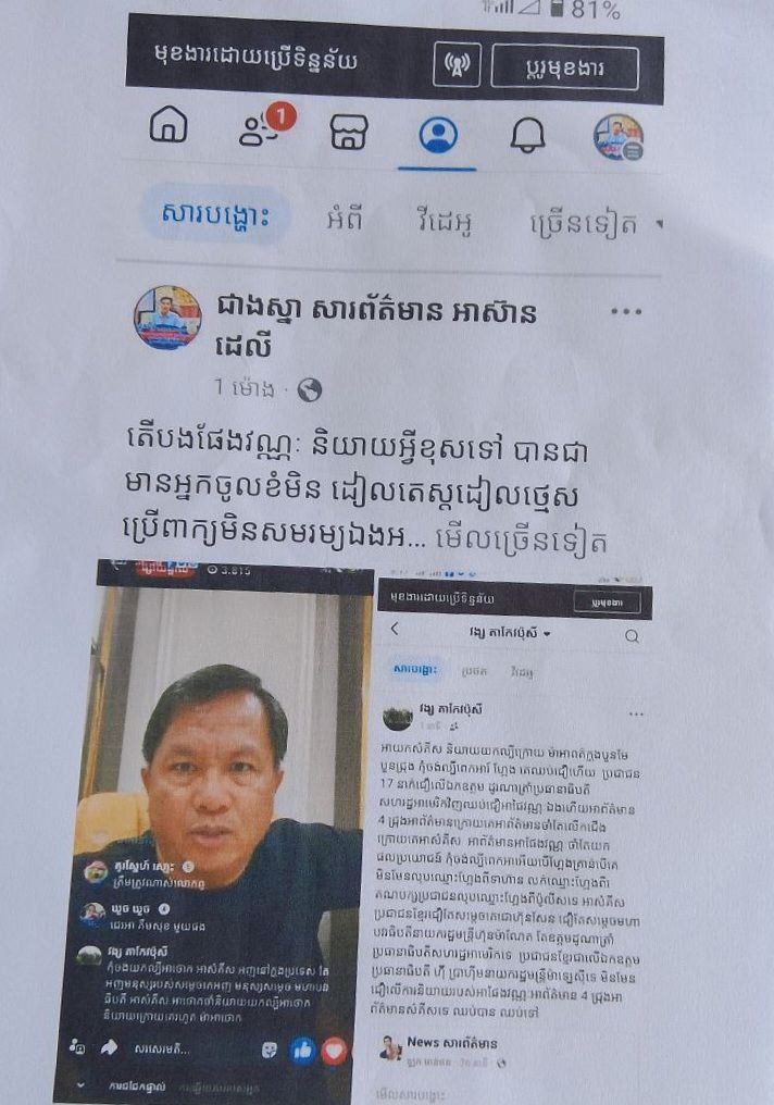 ហើយកាលពីពេលថ្មីៗ បុគ្គលខាងលើបានចូលខមមេនលើផេកផ្លូវការរបស់នលោក ផែង វណ្ណៈ ដោយប្រើពាក្យពេចន៍មិនគប្បីអាចធ្វើអោយមានការយល់ច្រឡំនិងរើសអើង លើបុគ្គលសញ្ញាតស្អំ ពោលគឺនិយាយគ្មានប្រភពយោង ខុសពីខ្លូនចូលខមមេនទៅលោក ប្រាក់ វាស្នា ដោយខ្លូនមិបានបិទបាំងប្រភពដលើតែគេលើកយោបលផ្សាយបែរជាទៅប្ដឹងចោទគេទាំងខុសទំនង ទៅវិញ ហើយមានចិត្ត សុច្ចរិតទាមទារសំណងជំងឺចិត្តទៅវិញ តើអង្គច្បាប់យល់ឃើញបែបដូចម្ដេច ? ។